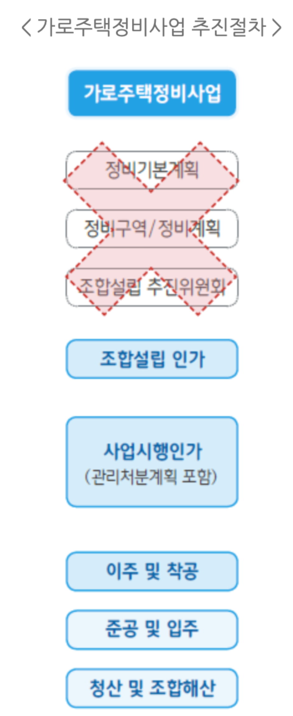 가로주택정비사업은 규모가 1만제곱미터 미만으로 작고, 정비기본계획, 정비구역, 조합설립과 같은 과정이 생략되므로, 재개발, 재건축에 비해 빠르게 진행되는 소규모 주거환경 개선사업입니다. 평균적으로 이 사업은 3~4년 안에 완료됩니다.